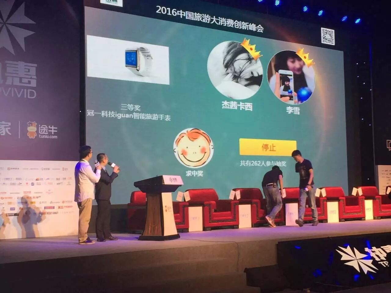 冠一科技執行董事曲潔在行業峰會上介紹智能旅游手表并抽獎,獎品為3塊iguan Watch